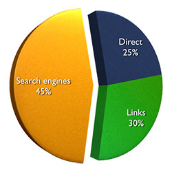 A peu près 40-50% des visites d'un site web bien organisé sont imputables aux moteurs de recherche. L'autre moitié du trafic consiste en des visites directes, par exemple si votre site a été mis en favori par vos visiteurs, ou si un site tiers fait un lien vers le vôtre. Il est donc crucial pour tout site de bien figurer dans les moteurs de recherche, et d'être suffisamment intéressant pour être recommandé sur d'autres sites.
